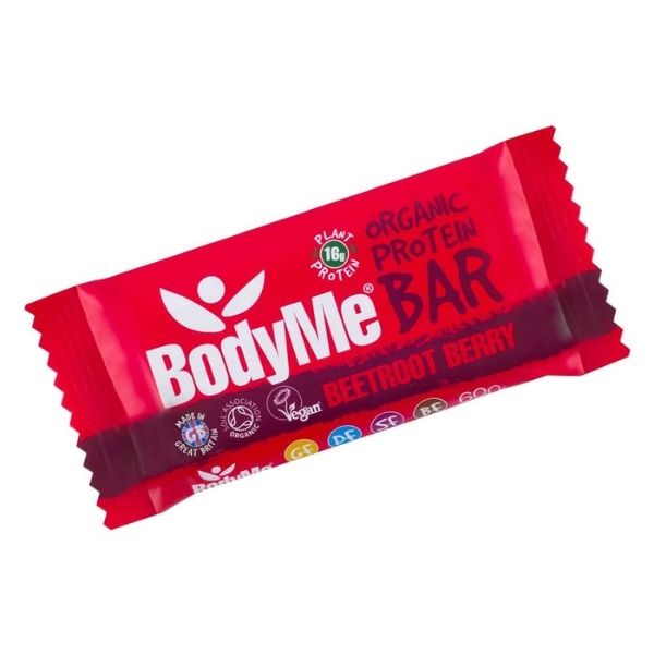 BodyMe veganska proteinska pločica s okusom bobičastog voća i cikle ukusan je i uravnotežen međuobrok napravljen od 100% prirodnih i certificiranih organskih biljnih sastojaka.