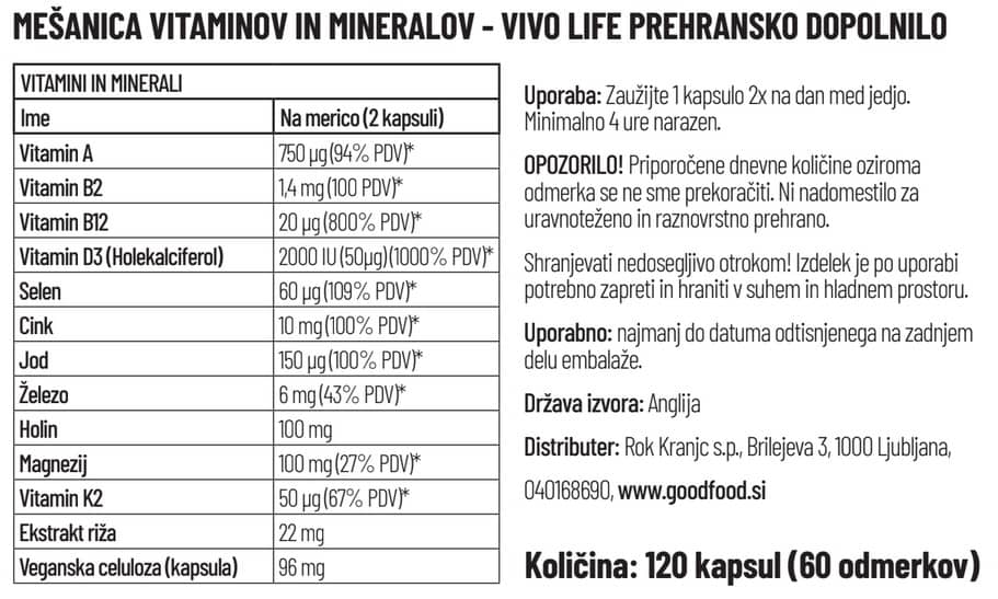 Vivo Life mješavina vitamina i minerala – napravljena isključivo od biljnih sastojaka. Potpuna formula vitamina i minerala – svi vitamini i minerali koji su vam potrebni u samo jednoj kapsuli.