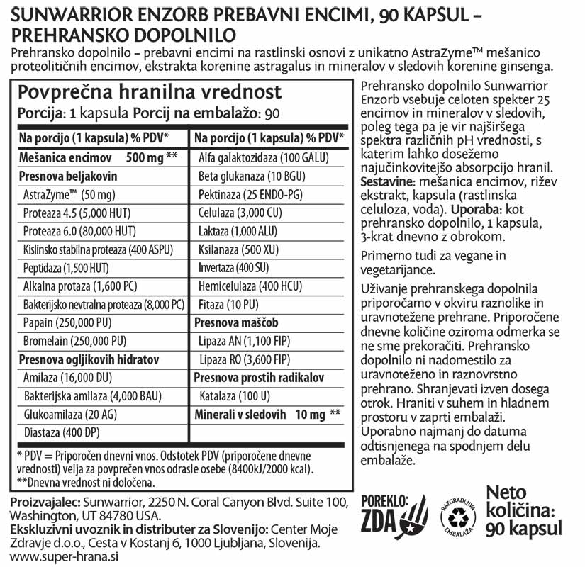 Sunwarrior Enzorb probavni enzimi, 90 kapsula – dodatak prehrani