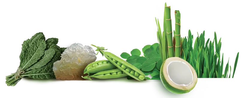 Organska kokosova voda, organski sok od mlade pšenične trave, organski zeleni prah u prahu (kelj, lišće špinata, alga spirulina), organski listovi moringe u prahu, organski pasji trn (izvor vitamina C), organska gljiva žuta jasika, organski sok od limuna, organski ekstrakt voća amla (izvor vitamina C), hijaluronska kiselina, silicijev dioksid dobiven iz ekstrakta bambusa, mješavina zelenila u prahu (klice brokule, ekstrakt luka, rajčica, brokula, mrkva, špinat, kelj, prokulice), simbiozna mješavina bakterijskih kultura (L- acidophilus, L-plantarum, L-casei, L-rhamnosus, B-lactis, L-salvarius, B-bifidum), biotin iz organskog ekstrakta lista svetog bosiljka i organskog suncokretovog ulja.