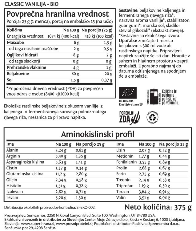Sunwarrior Classic biljni proteini (okus vanilije) iz fermentiranih i proklijala integralna smeđa riža. Classic jeizvor proteina u najčišćem obliku dobiven od fermentirane i proklijale smeđe riže cjelovitog zrna organske proizvodnje, bez alergena. Neka vas ne zavara blaga priroda riže. Sunwarrior Classic biljni proteini osiguravaju dovoljno proteina i povoljan omjer aminokiselina za svaki dan.