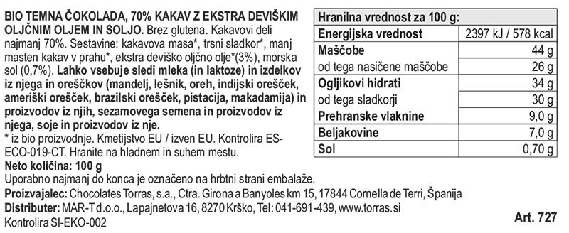 kakaova masa*, šećer od trske*, kakao maslac*, odmašćeni kakao prah*, ekstra djevičansko maslinovo ulje* (3%), sol u prahu (0,7%), emulgator (suncokretov lecitin*). Može sadržavati tragove mlijeka (i laktoze), orašastih plodova, soje i sezama. *Komponente organskog porijekla.