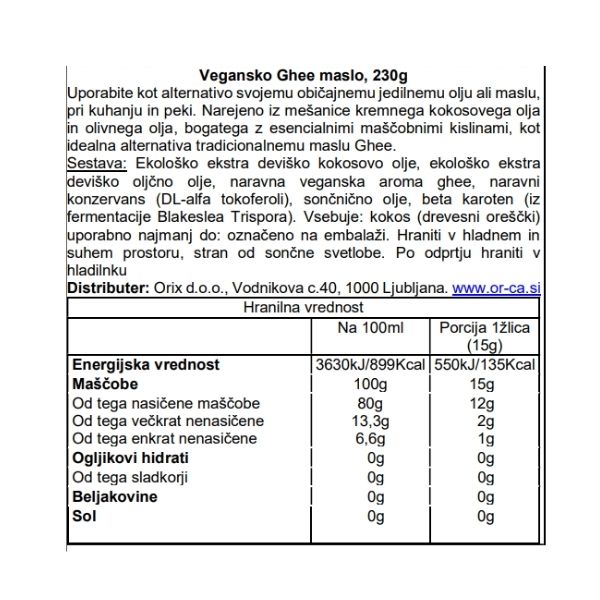 Organsko ekstra djevičansko kokosovo ulje, organsko ekstra djevičansko maslinovo ulje, prirodna aroma veganskog gheeja, prirodni konzervans (DL-alfa tokoferoli), suncokretovo ulje, beta karoten (iz Blakeslea Trispora fermentacije). Sadrži: kokos (orašasti plodovi)